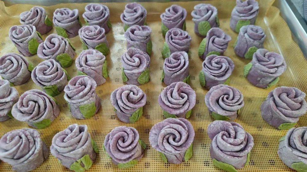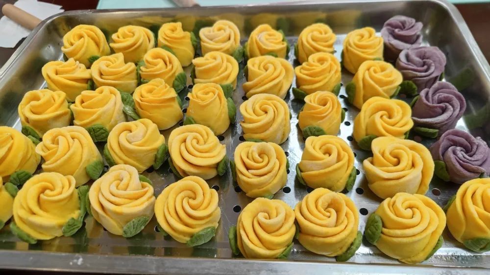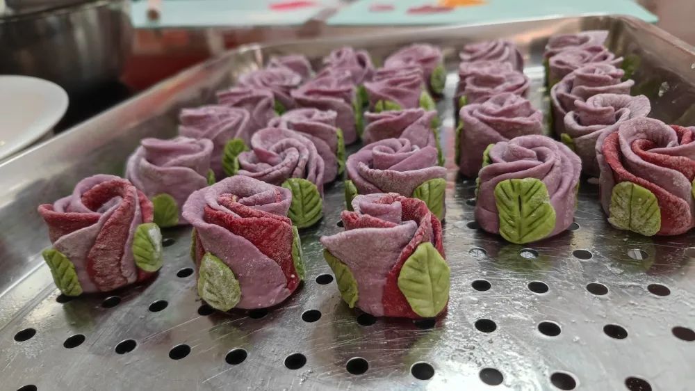 現(xiàn)場彌漫著一股綿密香甜的味道,新鮮的玫瑰花饅頭出鍋了!