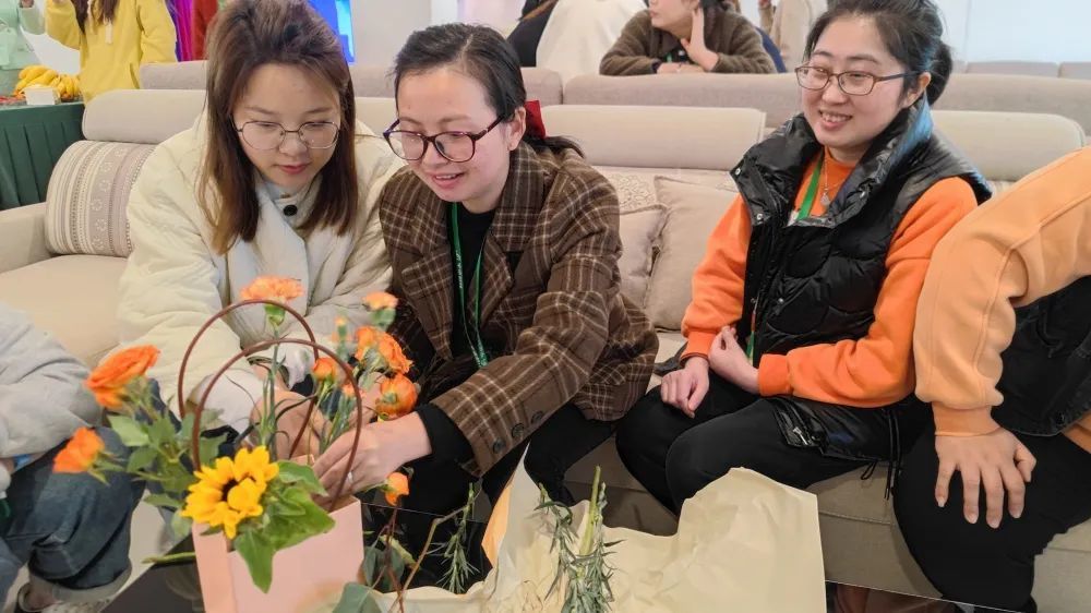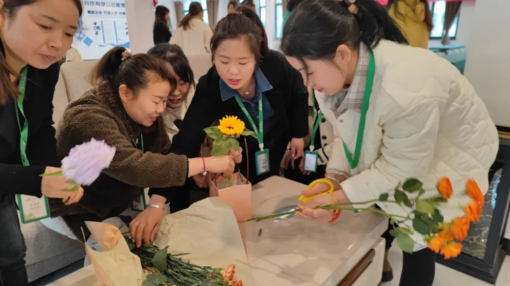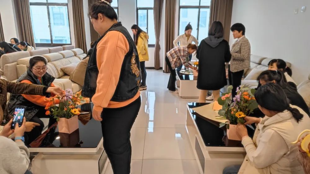 一枝枝小雛菊、向日葵等經(jīng)過女同胞們的巧手修枝剪葉,巧妙的創(chuàng)意組合,勾勒出一籃籃錯(cuò)落有致、色彩鮮艷的插花作品,寄托著女同胞們對美的理解和對幸福的感悟。